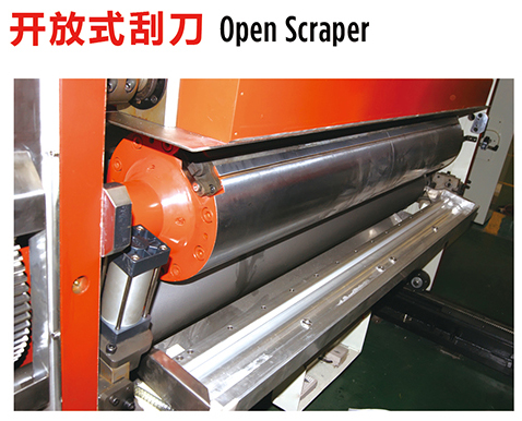 ● 開放式刮刀,采用單刮刀片,把陶瓷網(wǎng)紋輥表面多余水墨刮除,自動回流,減少水墨變質(zhì)。